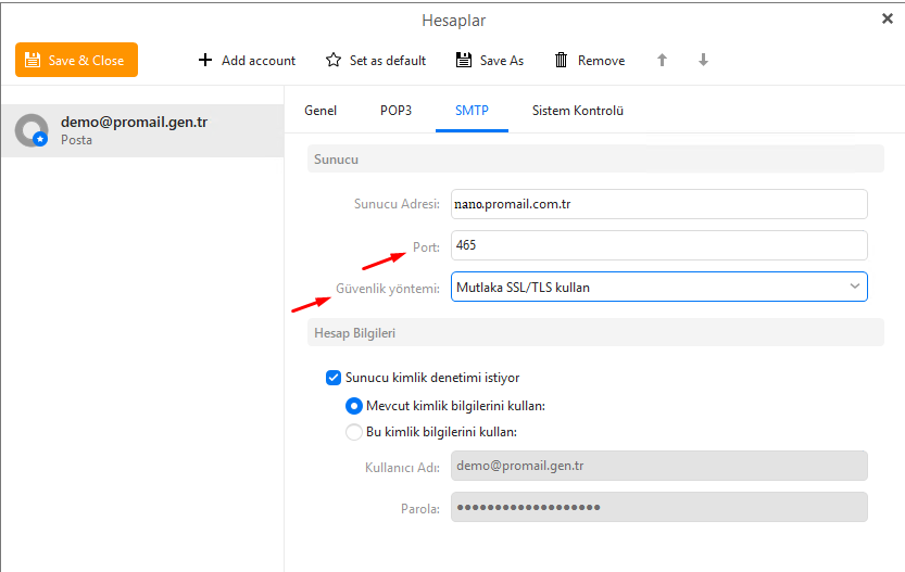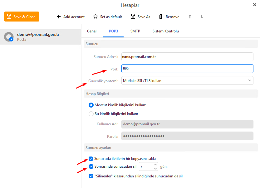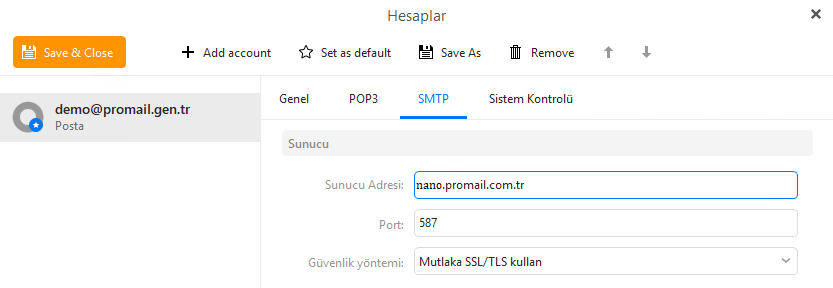 Save & Close butonu ile yapılan değişiklikler kaydedilmiş olur. ProMail® e-posta adresinin eM-Client mail istemcisine POP3 (SSL) kurulumu tamamlanmış olur. Artık bu uygulama üzerinden e-postalarınızı SSL sertifikası ile gönderip alabilirsiniz.