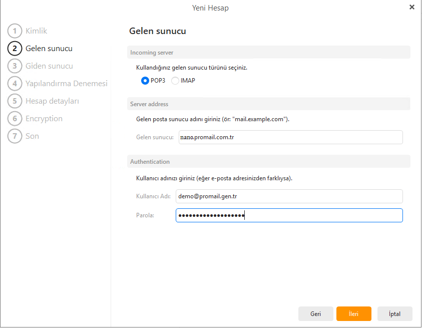 - Server address bölümünde Gelen sunucu satırına örnekte nano.promail.com.tr yazılmış ancak siz mail.alanadınız.com (mail.e-postanızın çalıştığı domain)yazın.