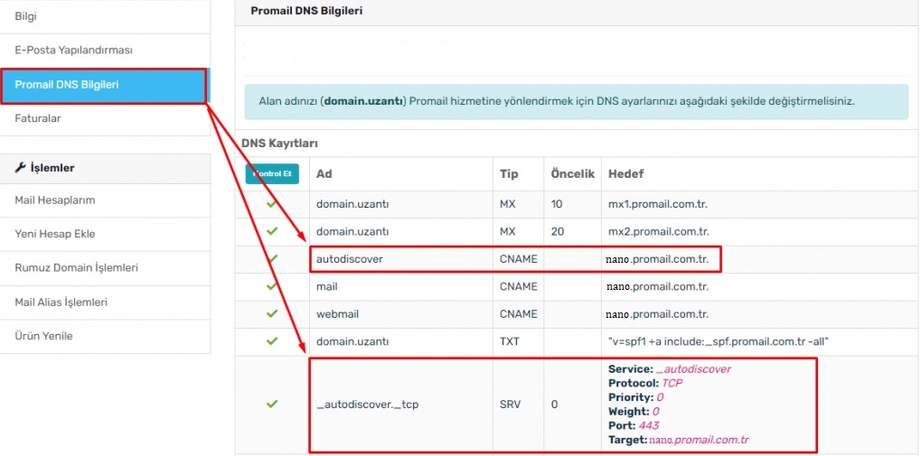 - autodiscover.domain.uzantı adresi için ProMail® tarafında SSL sertifikası aktif edilmiş olması gerekir. Aktif olup olmadığını buradan kontrol edebilirsiniz. Eğer aktif değilse promail.com.tr destek ekibine destek merkezi üzerinden giriş yaparak bilgi vermeniz yeterlidir.