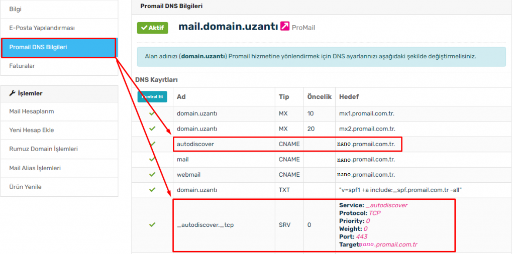 - Alan adına ait DNS tablosunda autodiscover.domain.uzantı adresine ait CNAME ve autodiscover için SRV kaydı girilmiş olmalıdır. Yönlendirilmesi gereken hedefi öğrenmek için Müşteri Paneli > Hizmetlerim > Yönet > Promail DNS Bilgileri sayfasını kontrol edebilirsiniz. Eğer bu iki kayıt DNS tablosunda yoksa Promail DNS Bilgileri sayfasında iletildiği gibi girilmesi gerekir.